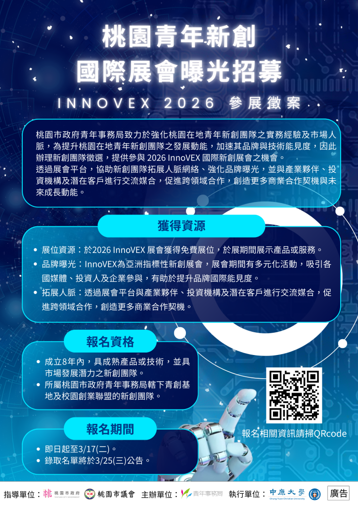 誠摯的邀請桃園在地青年新創團隊一起前進 InnoVEX 2026 國際新創展會。